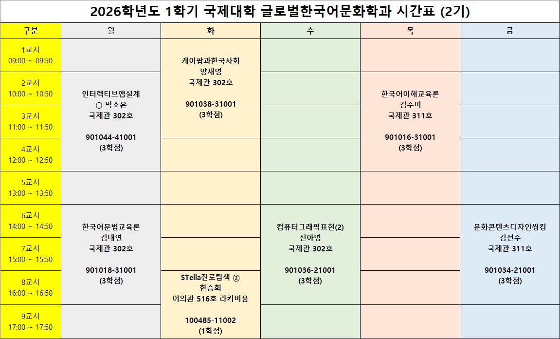 2026학년도 1학기 글로벌한국어문화학과(2기) 시간표입니다. 아래의 수강신청 기간 및 강좌 정보를 참조하여 기간 내 신청하시기 바랍니다. ※ 교양과목은 행정실에서 일괄 수강신청 진행하며, 전공과목만 학생이 직접 수강신청