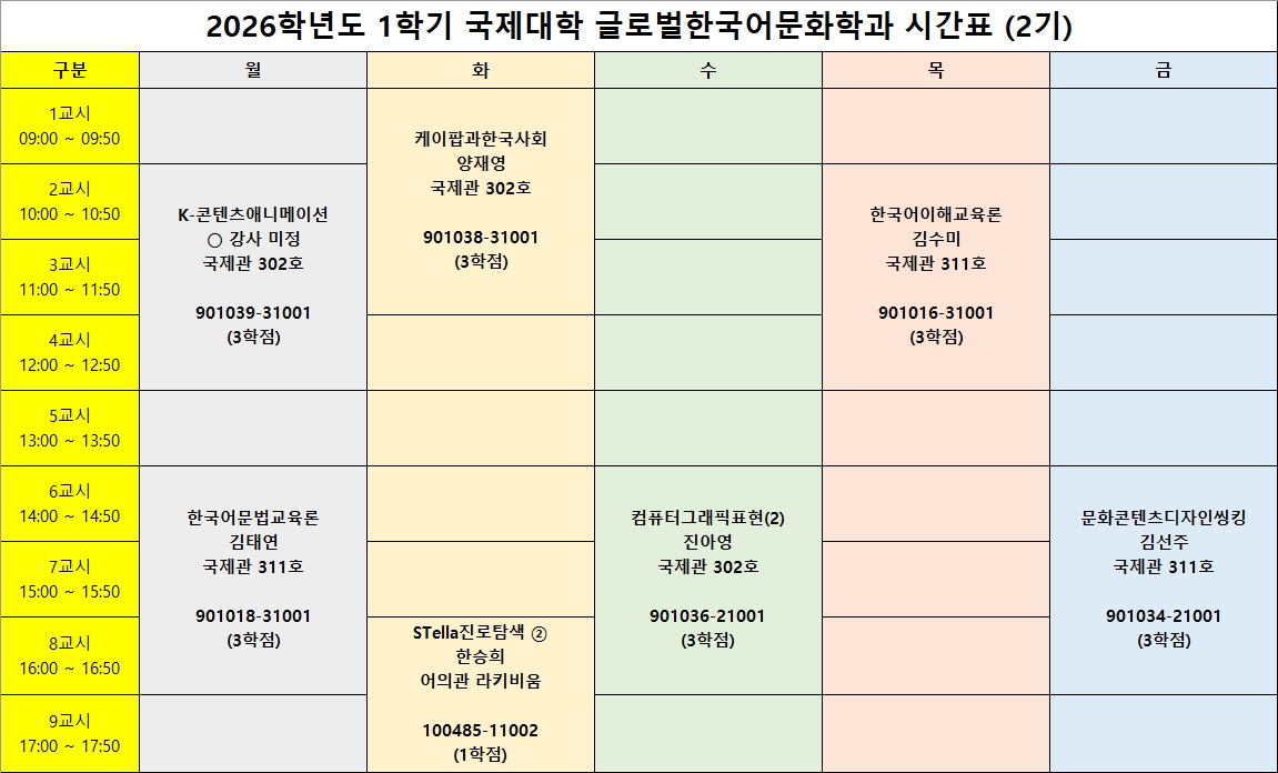 2026학년도 1학기 글로벌한국어문화학과(2기) 시간표입니다.