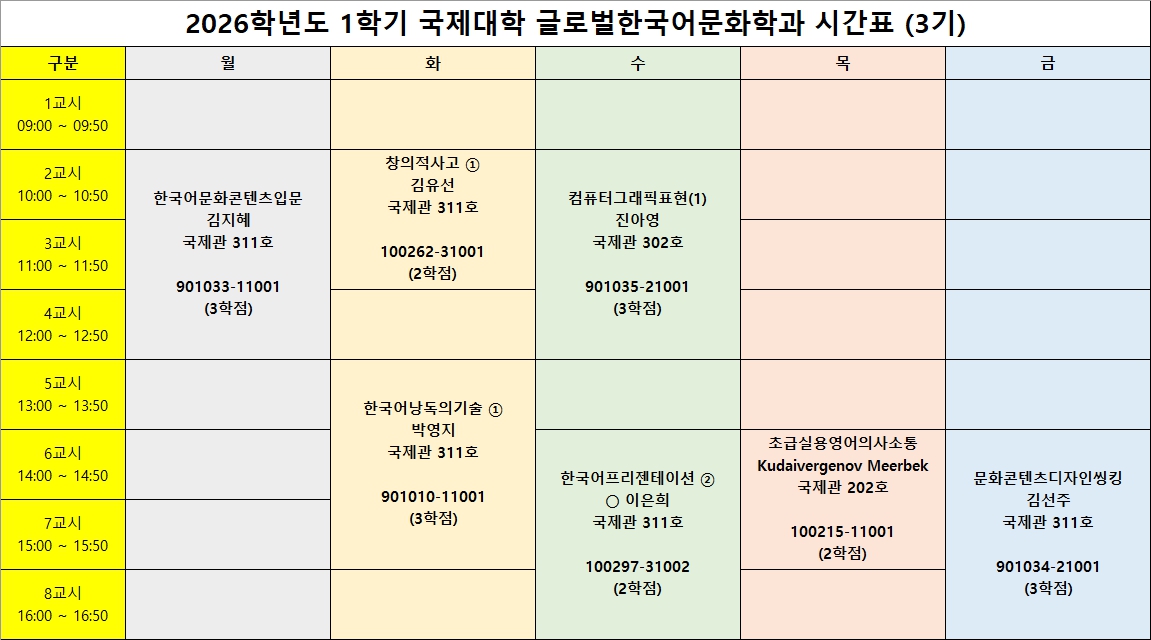 2026학년도 1학기 글로벌한국어문화학과(3기) 시간표입니다.