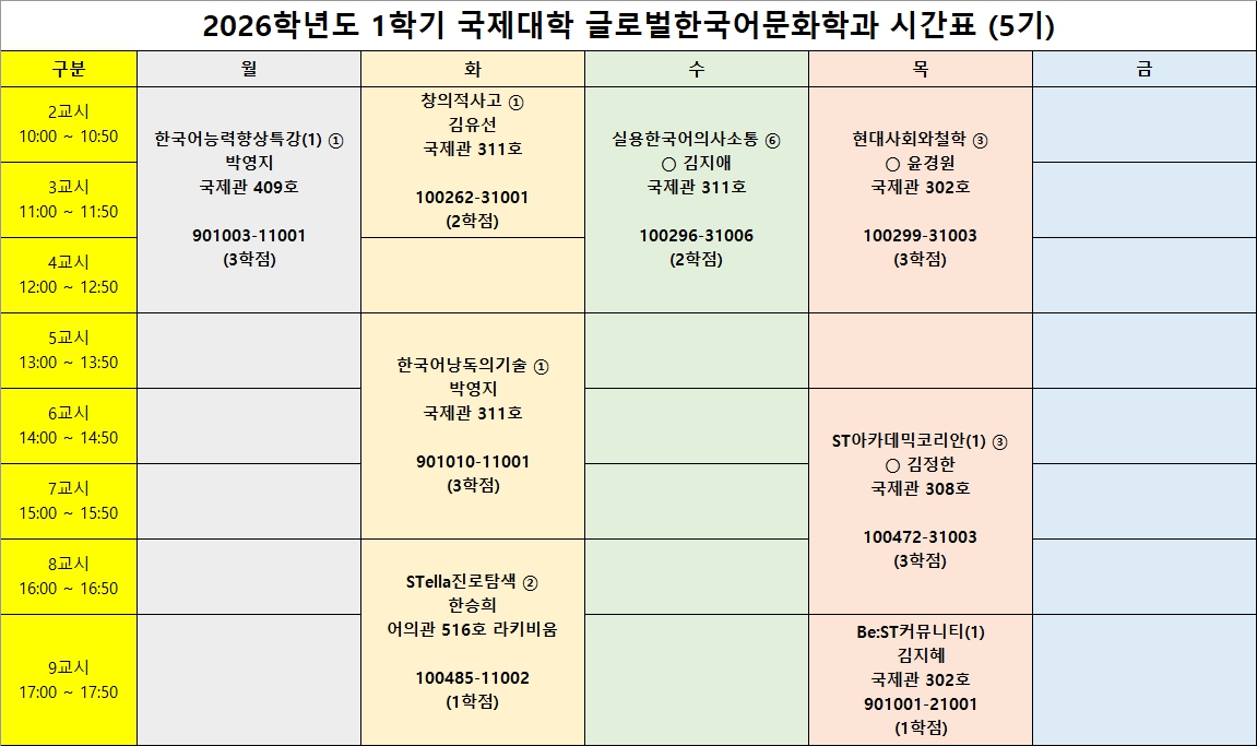 2026학년도 1학기 글로벌한국어문화학과(5기) 시간표입니다.